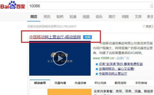 接下来,在打开的搜索结果页面中,点击进入中国移动网上营业厅官方网站。