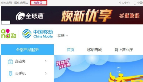 打开中国移动网上营业厅官网页面之后,点击页面左上角“登录”按钮,进入账号登录页面。