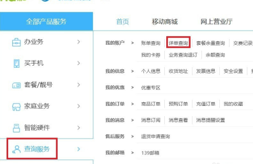 手机账号登陆成功之后,点击页面左侧列表,选择“查询服务-详单查询”选项菜单。