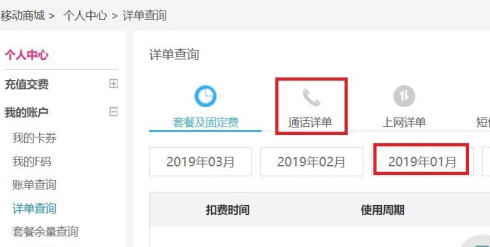 打开详单查询页面之后,点击页面顶部“通话详单”菜单项,并点击选择要查询的月份。